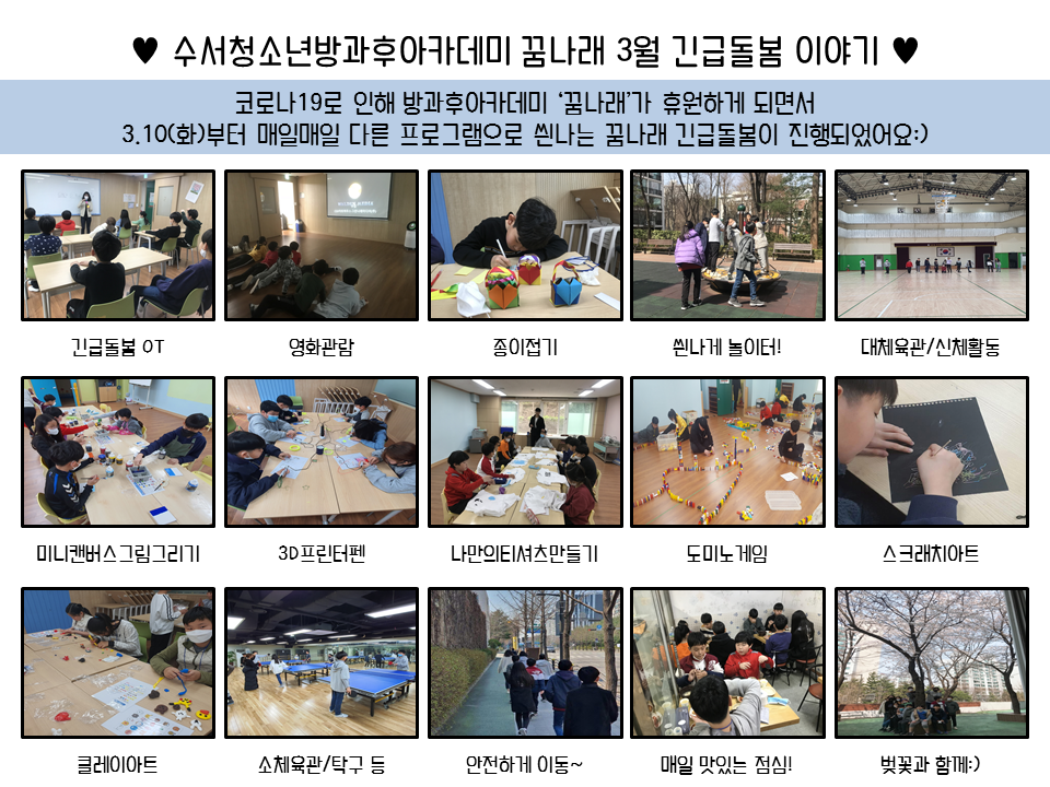 수서청소년센터 방과후아카데미 '꿈나래'는 코로나19로 인해 휴원하면서 등록 청소년의 여가시간을 효율적으로 활용하면서 안전하게 생활할 수 있도록 3.10(화)부터 긴급돌봄을 운영하고 있습니다. 비록 꿈나래 전원이 함께 생활할 수는 없지만, 소소하게나마 매일의 행복을 찾고 누릴 수 있음에 감사한 마음으로 하루하루를 보내고 있습니다! 어려운 시국으로부터 빨리 벗어나 걱정없이 즐겁게 생활할 수 있는 날이 오기를 간절히 바랍니다:)