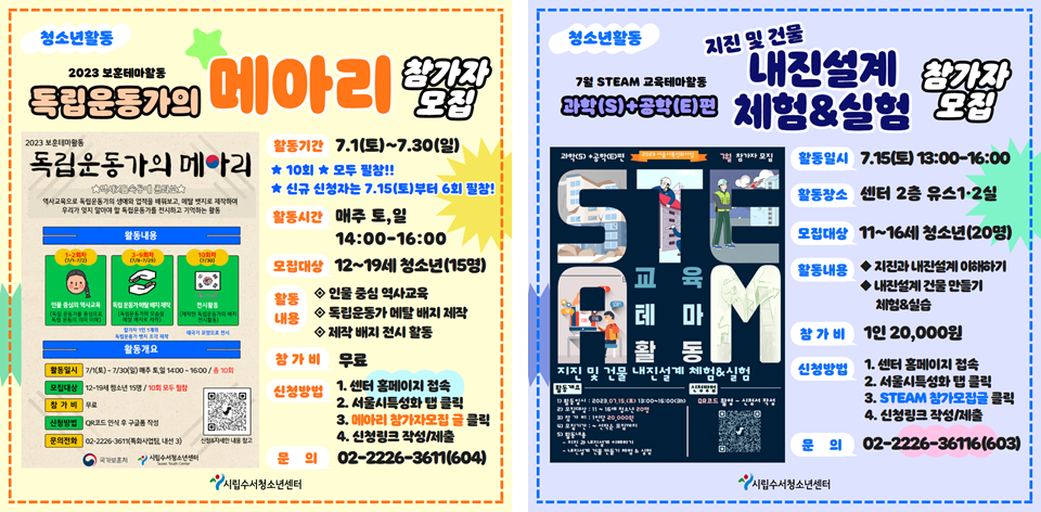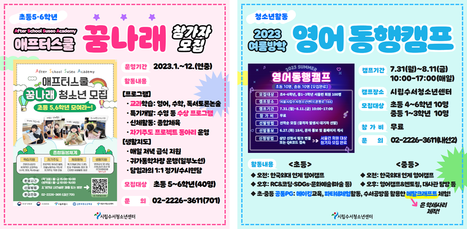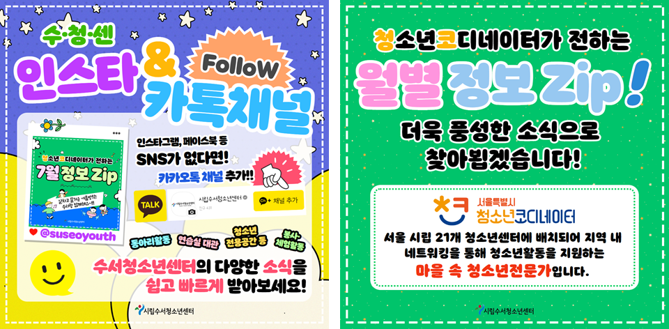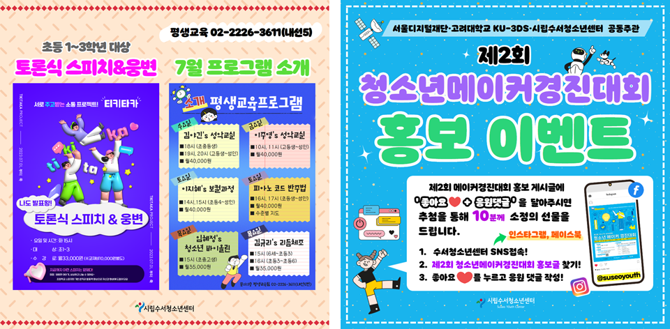 안녕하세요:^) 수서청소년센터 '청소년코디네이터' 입니다. 신나는 여름방학이 다가오는 7월! 수.청.센에는 어떤 다양한 소식이 준비되어있을지 궁금하시죠?! 문화예술, 역사, STEAM 등의 청소년활동 소식과 이러한 소식을 쉽게 받아볼 수 있는 SNS 팔로우 안내까지! 다채로운 수서청소년센터의 소식을 지금 함께 보시죠! 문화예술멘토링 '빛나리' 참가자 모집 안내 >>> http://www.youtra.or.kr/sub/sub070102.php?id=3160&page=1&mode=read STEAM 교육 '지진설계체험' 참가자 모집 안내 >>> http://www.youtra.or.kr/sub/sub070103.php?id=3229&page=1&mode=read 애프터스쿨 '꿈나래(초등5-6학년)' 참가자 모집 안내 >>> http://www.youtra.or.kr/sub/sub0804.php?id=2955&page=1&mode=read