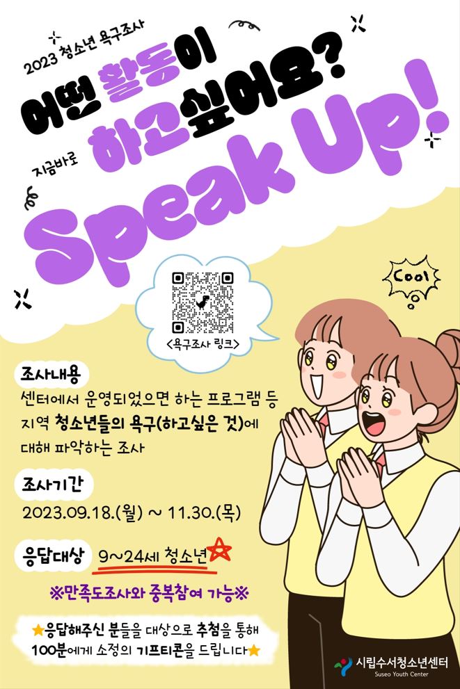 | 2023 청소년욕구조사 [Speak Up!] 참여하러 GOGO!!☞☞ |
