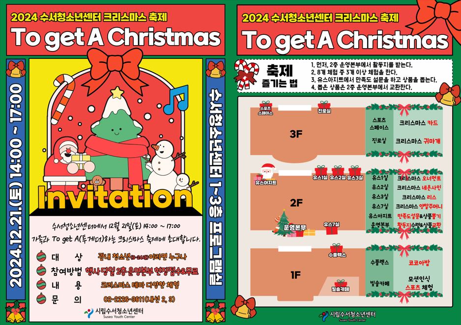 ❆수서청소년센터 크리스마스 축제 [To get A Christmas]에 초대합니다❆ ❅일시: 2024.12.21.(토) 14:00 ~ 17:00 ❅장소: 센터 내 프로그램실 * 행사 당일, 먼저 2층 운영본부(중앙 로비)를 들려주셔야 됩니다!!!!! ❅내용: 크리스마스 테마의 다양한 메이커 활동 ❅문의: 02-2226-3611(내선 2,3) * 자세한 내용과 활동은 아래의 포스터를 참고해주세요. 활동거리는 기관 사정에 따라 달라질 수 있습니다.