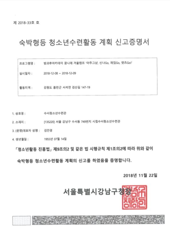 | [청소년수련활동 신고수리 내용고지] 2018 방과후아카데미 꿈나래 겨울캠프 |
