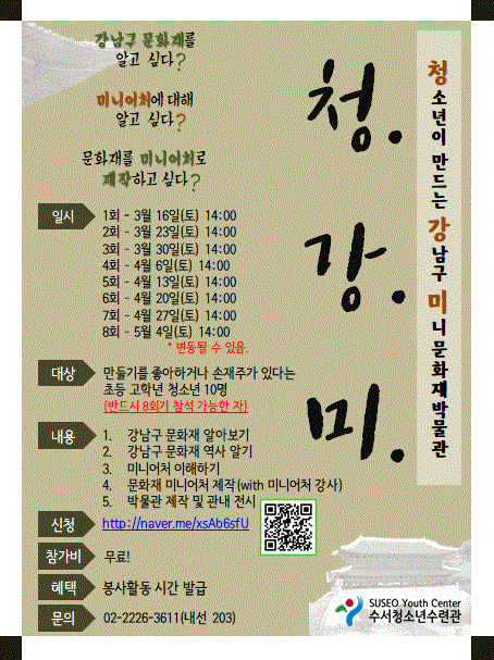 | 마감★청.강.미.(청소년이 만드는 강남구 미니 문화재 박물관) 참가자 모집 |