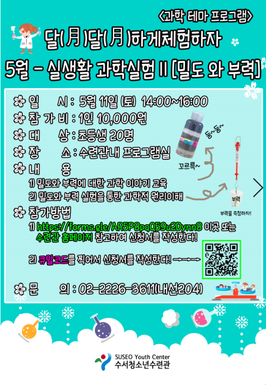 수서청소년수련관에서 "달(月)달(月)하게 체험하자" 5월달 참가자를 모집합니다!5월 "달(月)달(月)하게 체험하자"는 4월달에 이어서 실생활과학 두번째가 준비되어있습니다.체험의 주제로는 "밀도와 부력" 를 주제로 재미있는 실험과 체험활동을 할 예정이오니 많은 관심과 신청바랍니다^^ 감사합니다.