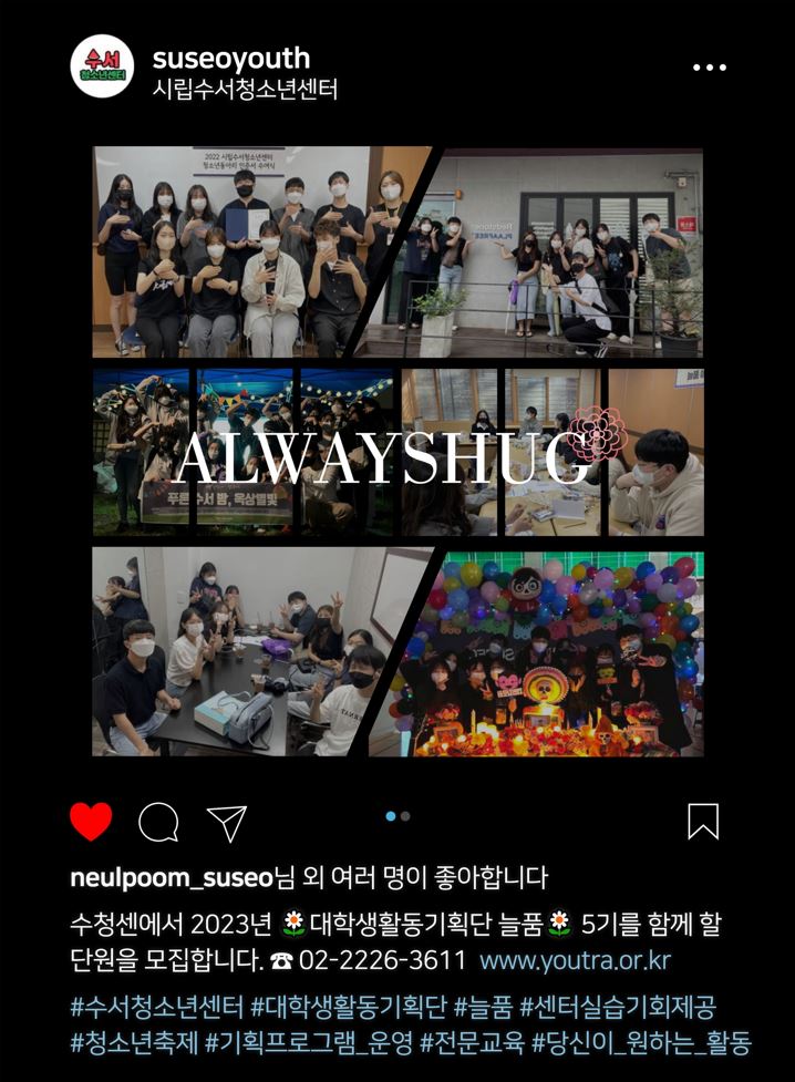 ⭐수청센의 자랑이자 최고의 아웃풋 대학생활동기획단 늘품 5기를 모집합니다!⭐ εïз 대학생활동기획단 늘품은 εïз - 청소년 축제, 행사 기획/운영 - 프로그램 기획 및 운영 - 희망전문교육, 워크숍 - 캠프, 행사 등 다양한 프로그램 보조진행 ★ 실습기회제공(only 늘품 대상) ★ 봉사시간 지급 등 >>>경험+실습기회 등 특별혜택까지 얻을 수 있는 성.장.행. TICKET<<< ꕤ모집대상ꕤ 청소년관련전공 대학생 1~4학년 (휴학생 참여 가능) ꕤ활동기간ꕤ 2023.02. ~ 2023.12. 월 2회 /토요일 정기회의 ꕤ활동혜택ꕤ 실습기회제공, 봉사시간 지급, 청소년현장 경험 및 실무역량 향상 ꕤ모집기간ꕤ 2023.01.02.(월) ~ 2023.01.31.(화) ꕤ신청링크ꕤ ☎ 02-2226-3611(내선203) 청소년사업팀 -------------------------------------------------------------------------------------------- |