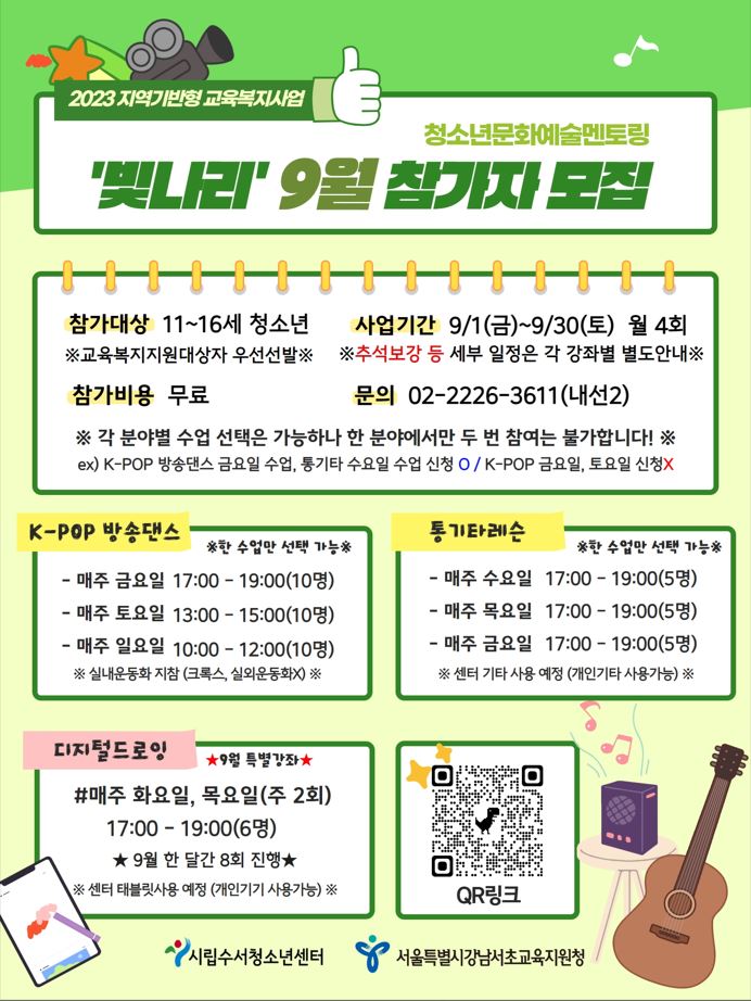 < 2023 지역기반형 교육복지협력사업 > ♥청소년문화예술멘토링 [빛나리] 참가자 모집♥ 강남서초교육지원청과 함께하는 문화예술멘토링 '빛나리'의 9월 참가자를 모집합니다!