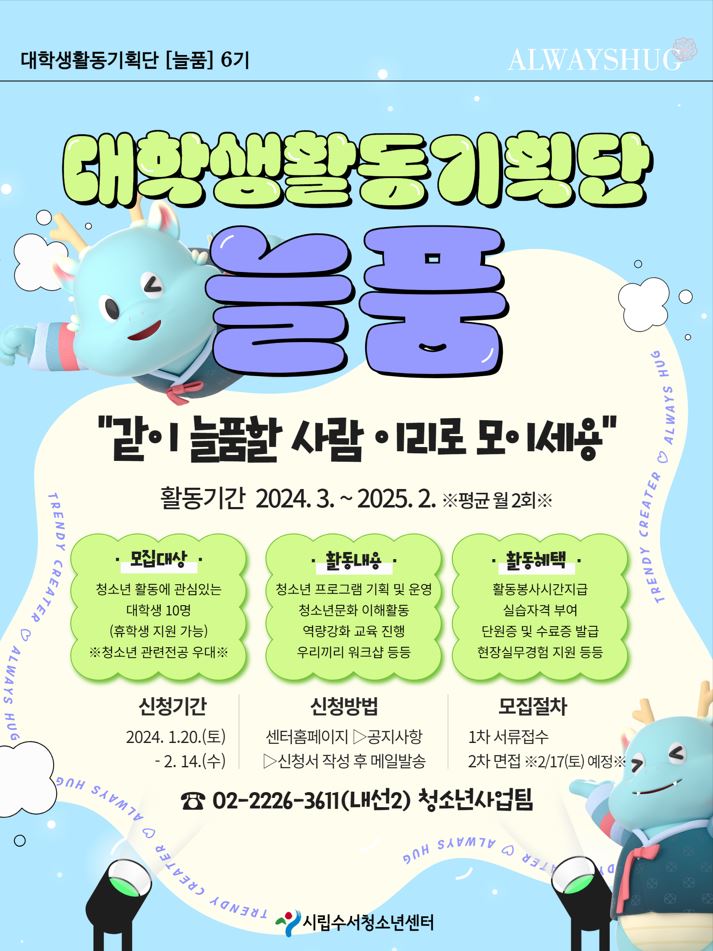 ⭐대학생활동기획단 6기 모집⭐ >>>경험+실습기회 등 특별혜택까지 얻을 수 있는 성.장.행. TICKET<<< 2024 늘품하며 찌~~인한 시간보내고싶은 대학생들 어서 모이세용~~คʕ•ﻌ•ʔค ✉e-mail : youtra2226@naver.com ☎ 02-2226-3611(내선203) 청소년사업팀 ------------------------------------------------------------------------------------------------------------- |