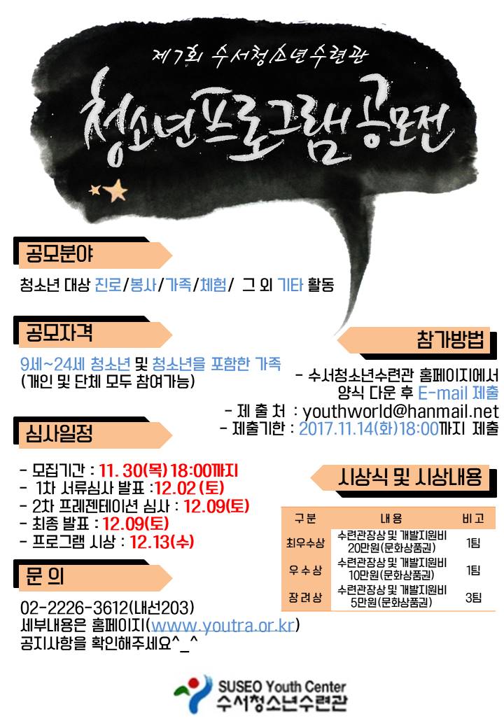 "너의 의견이 반영된 재미있는 청소년 프로그램을 만들어봐!" 2017 수서청소년수련관에서는 청소년활동에 청소년의 의견을 반영하고 좀 더 재미있고 유익한 청소년활동을 제공하기 위하여 청소년프로그램공모전을 실시합니다. 접수기간은 아래와 같이 연장되니 확인하시어 신청 부탁드립니다 청소년 및 가족 여러분의 많은 참여 부탁드립니다. 참가신청은 첨부된 신청서 파일을 작성하여 이메일 youthworld@hanmail.net 로 제출해 주세요^_^