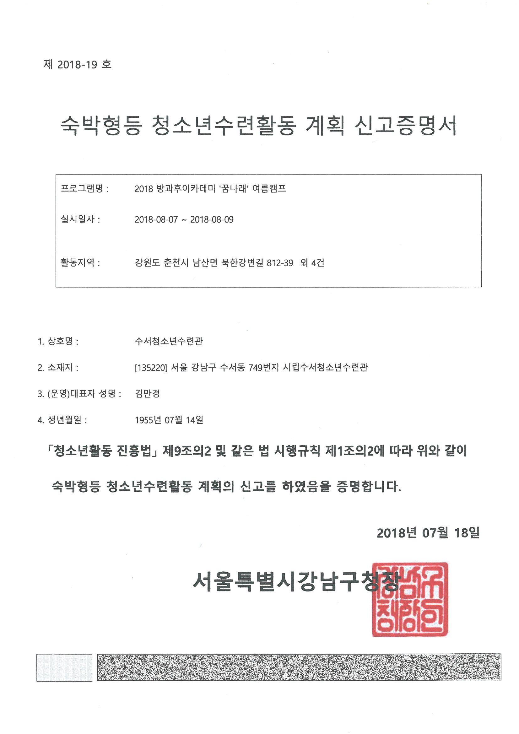 · 보험가입 - 보험명: 방과후아카데미 전용보험 - 보험사: 현대해상화재보험 - 가입기간: 2018.03.01.~2019.03.01. - 계약번호: F-18KY-WA00326