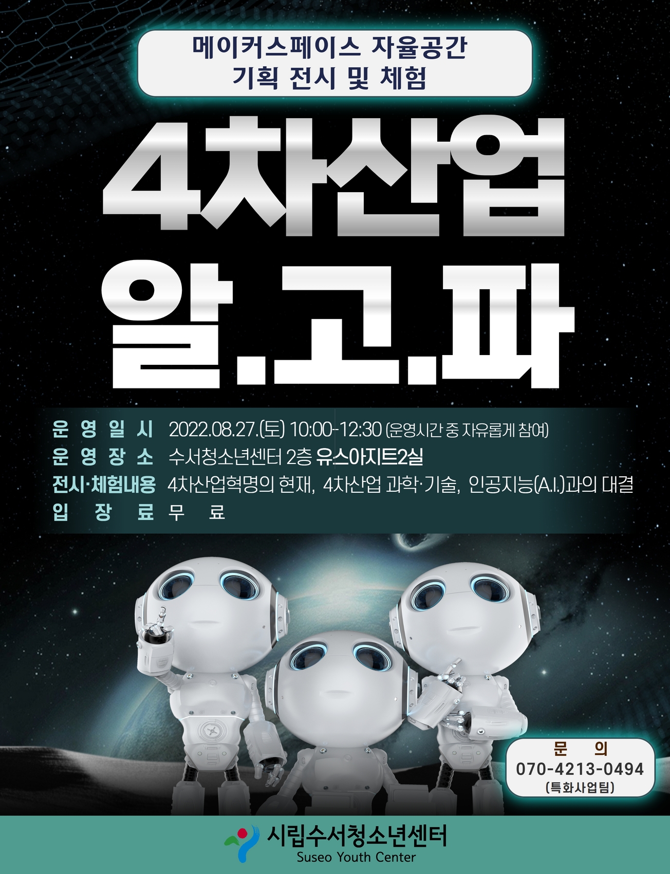 ◆ 운영일시: 2022.08.27.(토) 10:00~12:30 (오픈부스형-운영시간 중에 자유롭게 참여) ◆ 운영장소: 수서청소년센터 2층 유스아지트2실 ◆ 입장료: 무료 ◆ 전시·체험내용 - 4차산업혁명의 현재와 미래 - 4차산업 관련 과학과 기술 - 인간과 인공지능(A.I.)의 대결 등 ◆ 기타안내 - 별도의 신청 없이 입장이 가능합니다.(입장시 방명록 작성) - 안전을 위해 9세 미만의 영유아는 입장을 제한합니다. - 전시실 내 동시입장인원은 최대 10명으로 제한합니다. - 프로그램 운영시간 중에는 유스아지트2실 자율이용은 불가합니다. ◆ 문의: 070-4213-0494(특화사업팀) |