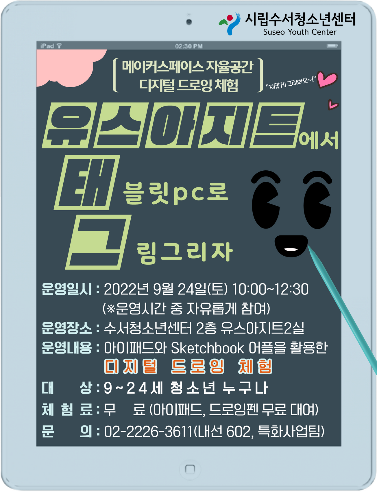 수서청소년센터에서 디지털 드로잉 체험 "유스아지트 태그(태블릿pc로 그림그리자)"를 운영합니다. 청소년 여러분의 많은 참여 바랍니다~!