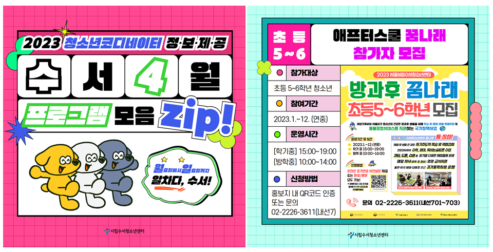 [초등5~6학년 방과후 꿈나래] 02-2226-3611(내선7)_방과후아카데미 [청소년활동 동아리/일일대관] 02-2226-3611(내선2)_청소년사업팀 [청소전활동(STEAM)/전용공간] 02-2226-3611(내선6)_특화사업팀 [평생교육 강좌문의·신청관련] 02-2226-3611(내선5)_평생교육팀