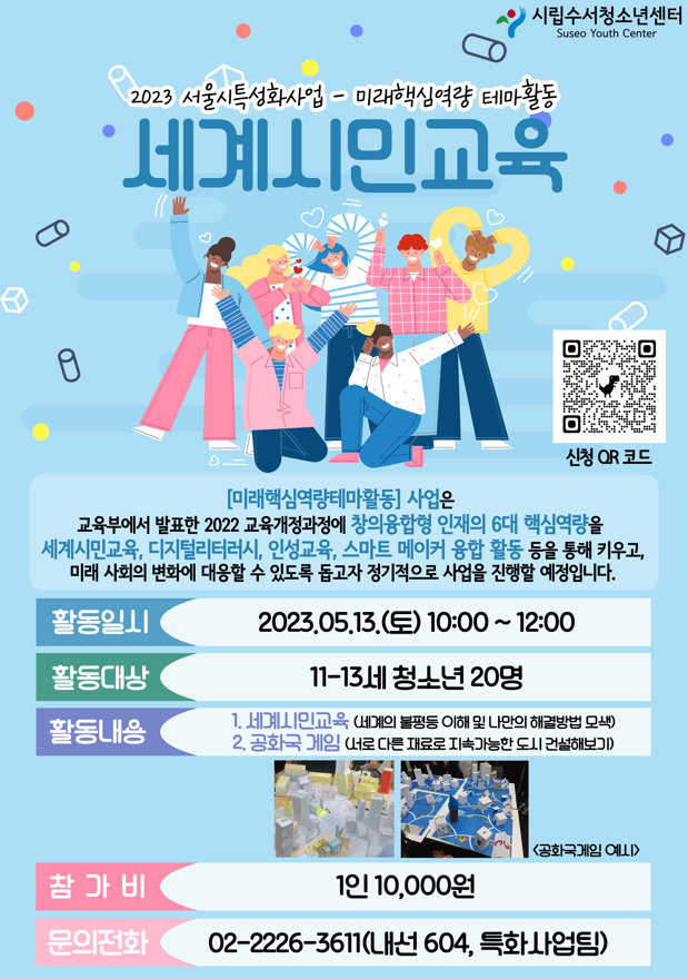 서울시립수서청소년센터에서는 교육부에서 발표한 2022 교육개정과정에 창의융합형 인재의 6대 핵심역량을 세계시민교육, 디지털리터러시, 인성교육, 스마트 메이커 융합 활동 등을 통해 키우고, 미래 사회의 변화에 대응할 수 있도록 돕고자 2023 서울시특성화사업 - 미래핵심역량테마활동사업을 운영하고 있습니다. * 창의융합형 인재 : 인문학적 상상력과 과학기술 창조력을 갖추고 바른 인성을 겸비하여 새로운 지식을 창조하고 다양한 지식을 융합하여 새로운 가치를 창출할 수 있는 사람 * 창의융합형 인재의 6대 핵심역량 : 자기관리, 지식정보처리, 심미적 감성, 협력적 소통, 공동체, 창의적 사고 2023 서울시특성화사업 - "미래핵심역량테마활동사업"은 연 5회로 진행되며, 세계시민교육, 디지털리터러시, 인성교육, 스마트 메이커 융합 활동 등 5개 주제로 6대 핵심역량의 맞춤형 활동 진행 예정입니다. <미래핵심역량테마활동사업 - 미래핵심역량Ⅰ(세계시민교육)> ♥ 일시 : 2023.05.13.(토) 10:00 ~ 12:00 ♥ 내용 : 월드투게더 세계시민학교와 연계한 세계시민교육의 이해 1) 세계의 불평등 이해 및 나만의 해결방법 모색) 2) 공화국 게임(서로 다른 재료로 지속 가능한 도시 건설해보기) ♥ 대상 : 11~13세(초4~초6) 청소년 20명(*선착순 모집) ♥ 장소 : 수서청소년센터 내 프로그램실 ♥ 참가비 : 10,000 원 / 1인 당 ♥ 신청방법 : https://forms.gle/1AG4WrnA43vDC2oA7 링크 접속한 뒤, 작성하고 제출하기 버튼 ♥ 문의 : 02-2226-3611 특화사업팀(내선 604) 많은 관심과 신청 부탁드립니다♥