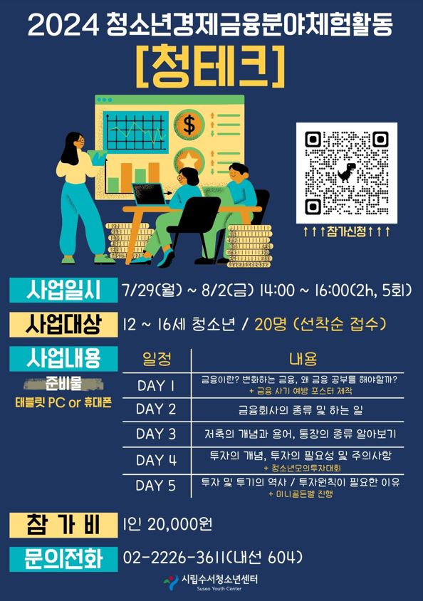 올바른 경제관을 형성하고, 자기주도적 의사결정 능력을 키우기 위해 청소년들을 위한 청소년들의 재테크(aka 청테크)의 참가자를 모집합니다. ✿ 일시 : 2024.07.29.(월) ~ 2024.08.02.(금) / 14:00~16:00 (★★5회 모두 필참해주셔야 됩니다★★) ✿ 내용 : 회차별 내용 상이