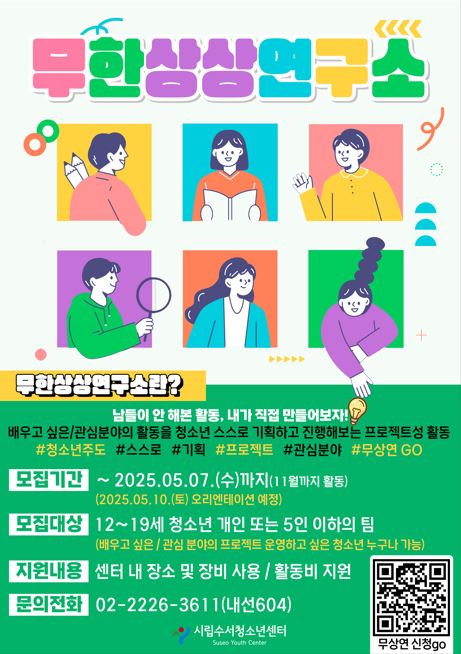 ★ 모집기간 - ~2025.05.07.(수)까지(선착순 접수) ★ 활동기간 - 활동 시작일 ~ 11월 (무한상상연구소 O.T - 5/10(토) 진행 예정) ★ 활동대상 - 12~19세 청소년 개인 또는 5인 이하의 팀(선착순 접수) ★ 활동내용 - 내가 직접 기획하고 실행하는 프로젝트! - [무한상상연구소] 활동계획서 바탕으로 나만의 개인/팀 프로젝트 활동 진행 ✔️ \'무한상상연구소\' 활동계획서는 [수서청소년센터 - 홈페이지] 게시 ★참가방법