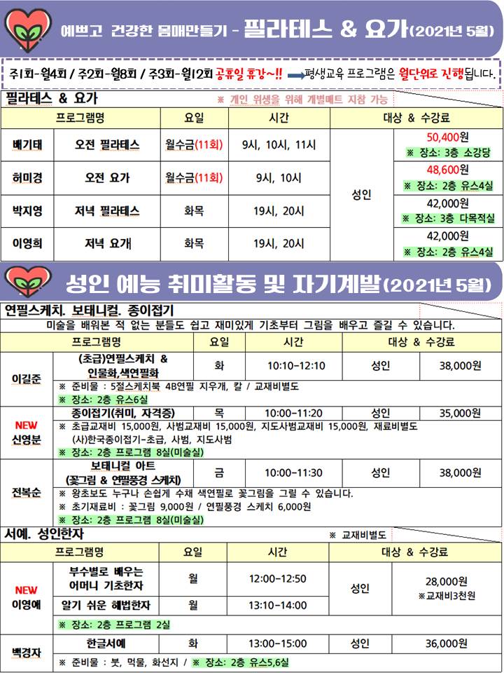 5월개강[성인]필라테스. 요가. 예능. 자기계발 프로그램