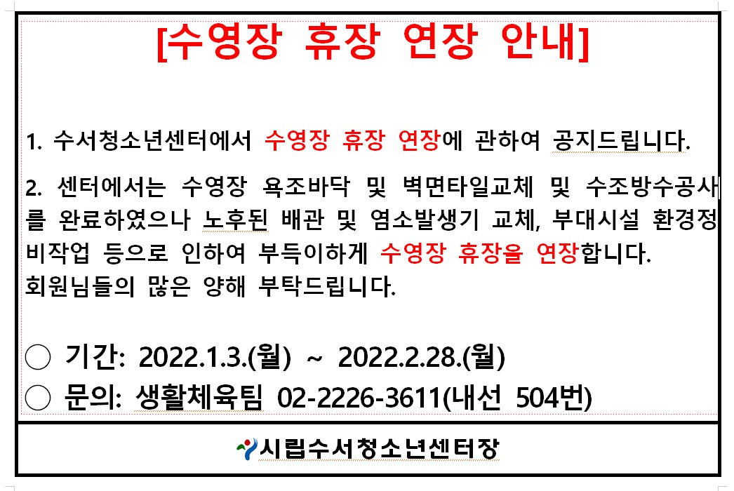 수영장 휴장 연장 안내(1월1일~2월28일)