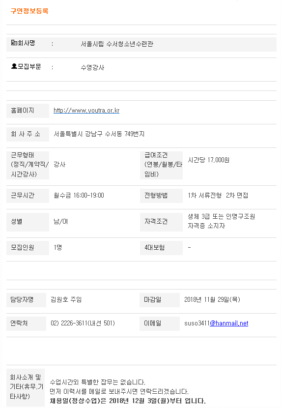 수서수련관 오후수영강사모집(월수금 16:00~19:00