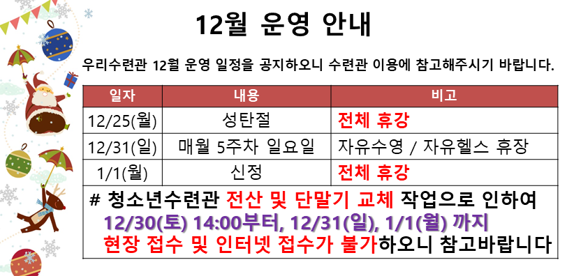 12월 25일(월) 전체프로그램 휴강에 따라 방문접수는 불가합니다.